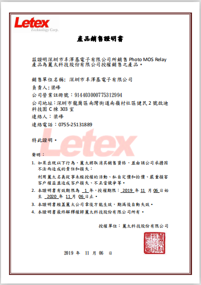 麗太科技股份有限公司授權(quán)深圳市豐澤基電子有限公司成為麗太(LETEX)的代理商,致力于“麗太(LETEX)”在大中華區(qū)的市場推廣